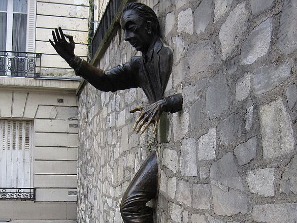 壁抜け男: 住宅街の壁からひょっこり現れる不思議な男の像。手を握ると幸せになれるという噂も?