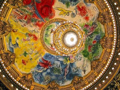 シャガールの天井画: 劇場内に一歩踏み入れると、天井にはマルク・シャガールが描いた鮮やかな色彩の絵が広がっています。伝統的な建物とモダンなアートが共存する、パリらしい奇跡の空間です。